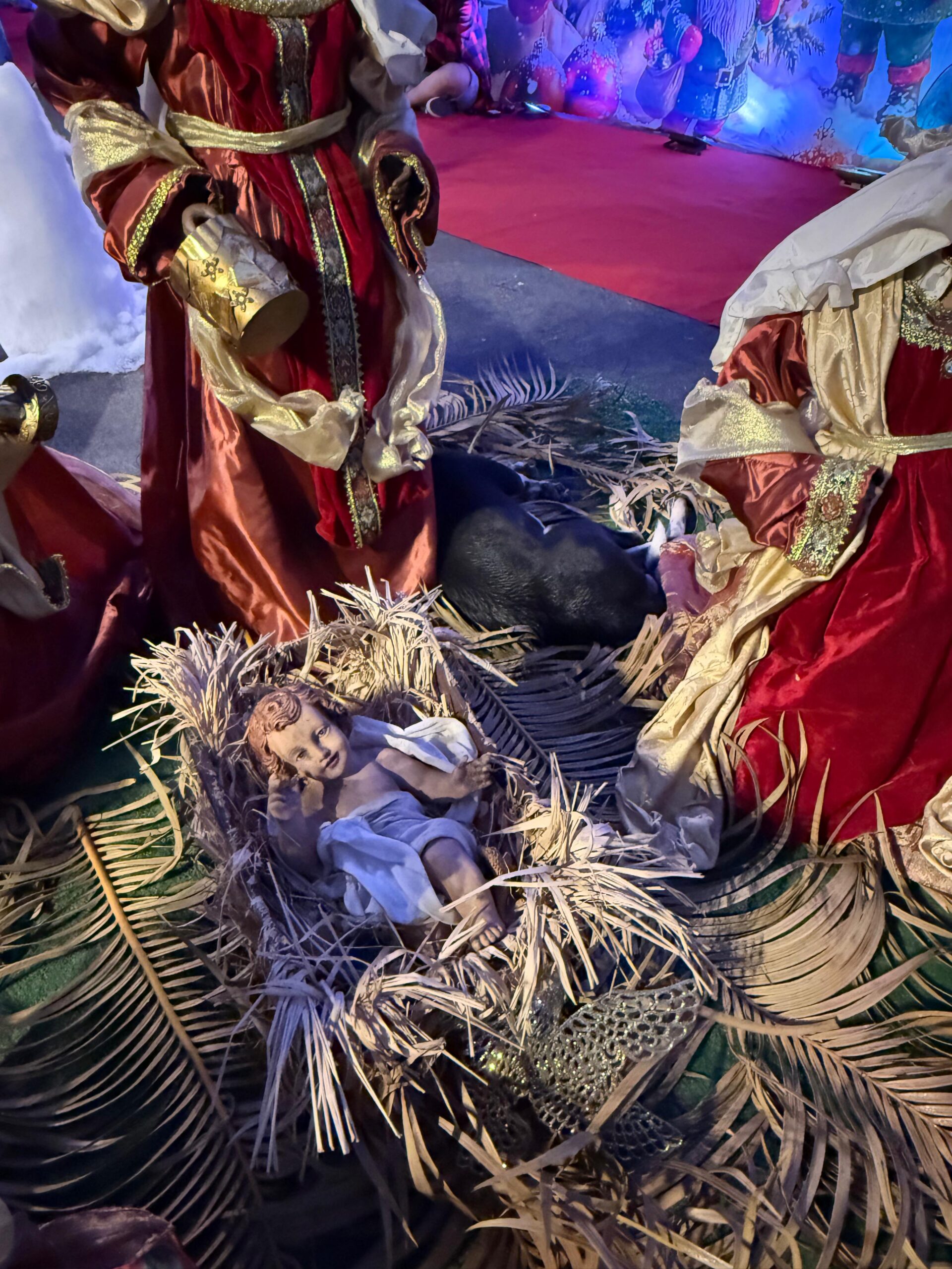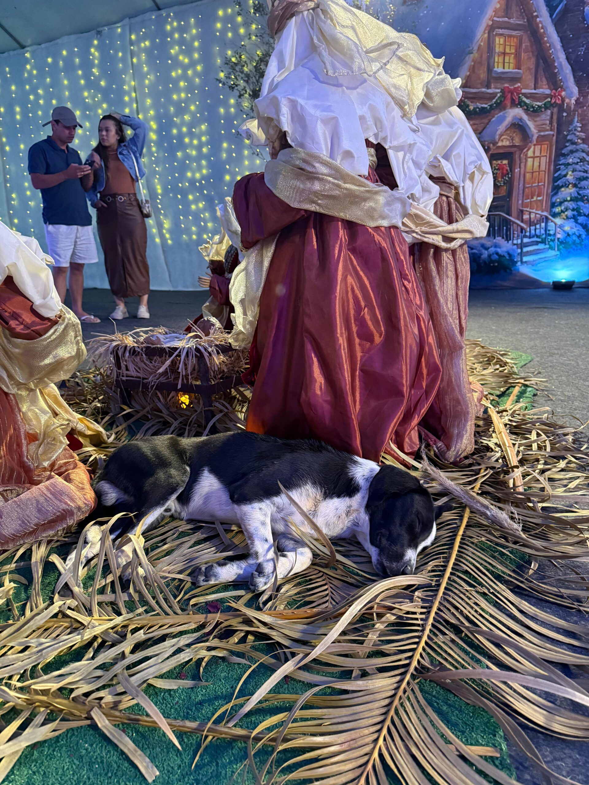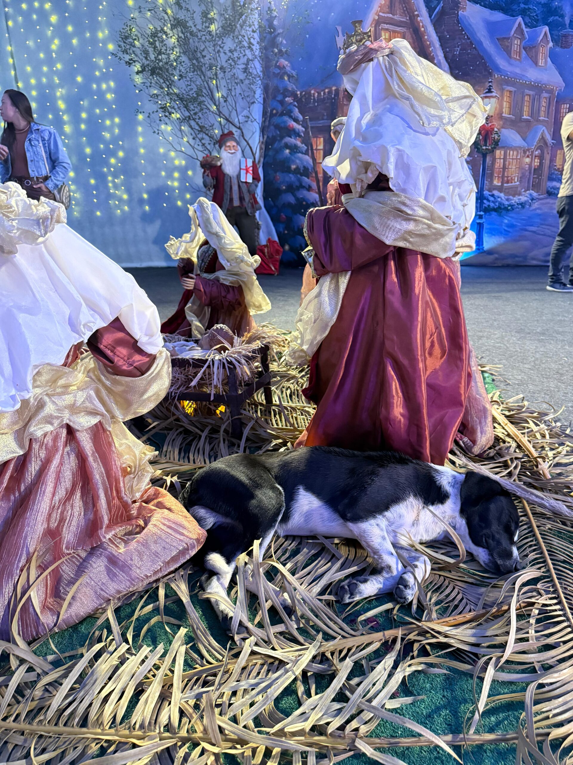 Cachorro chama atenção ao se deitar no presépio durante o Natal de Luz em Guaçuí
