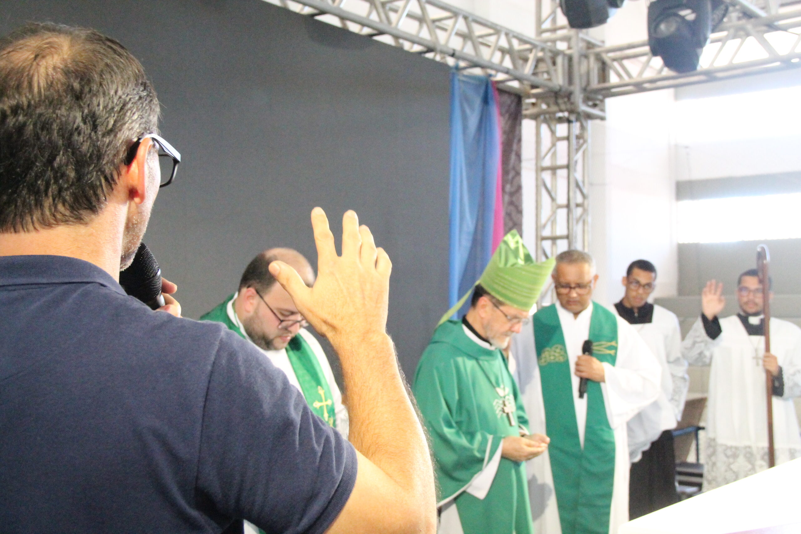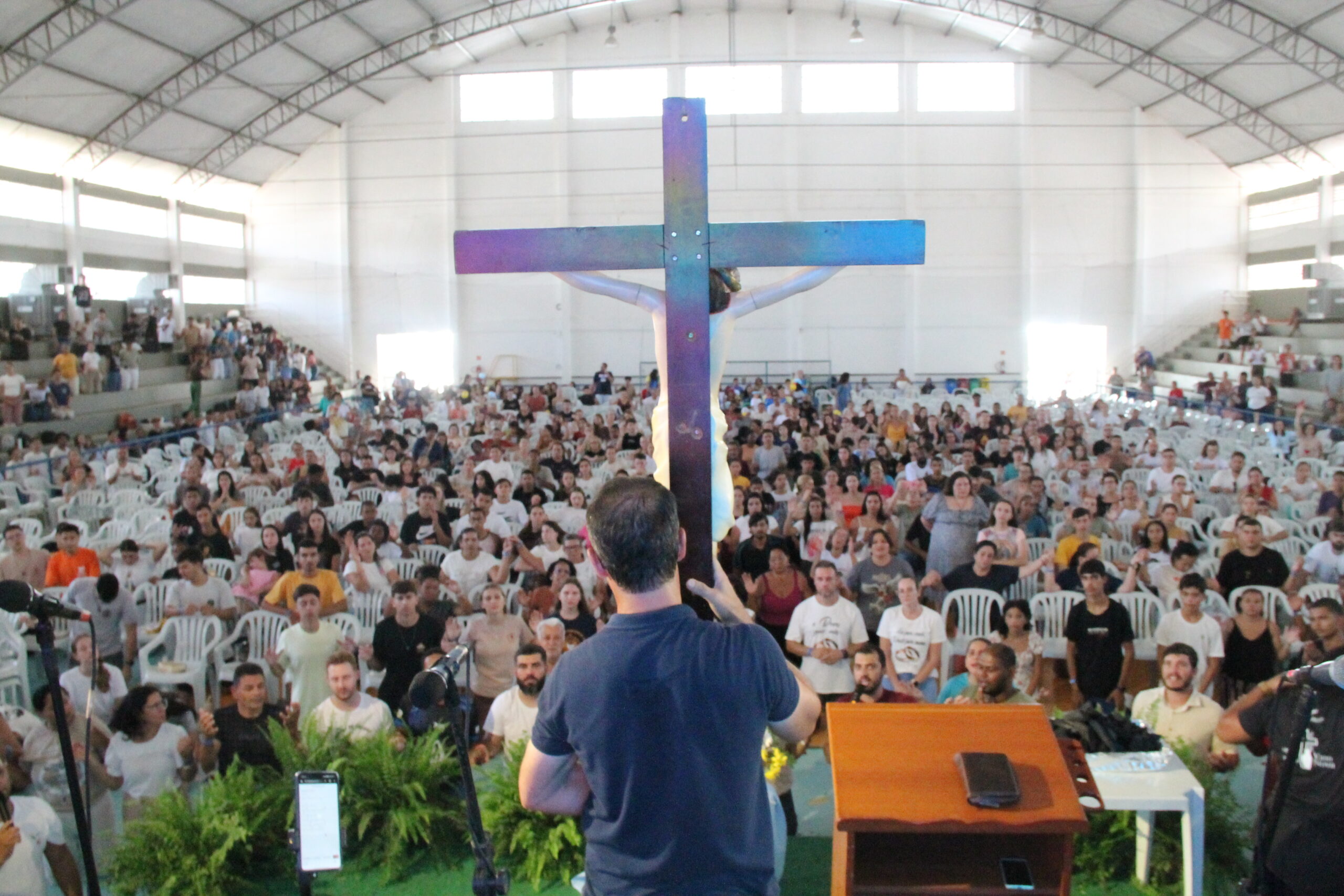 Fiéis reunidos no Pavilhão de Carapina durante momento de louvor e animação, marcando a 32ª edição do Vinde e Vede, que reuniu cerca de 7.500 participantes.
